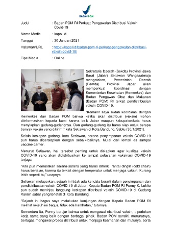 Judul : Badan POM RI Perkuat Pengawalan Distribusi Vaksin