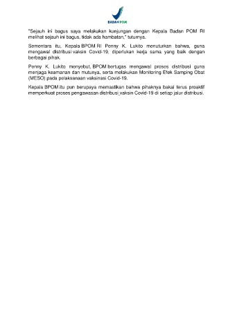 Penny  K.  Lukito  menyebut, BPOM bertugas  mengawal  proses  distribusi  guna