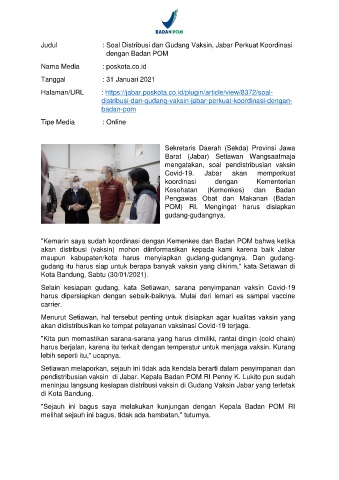 Judul : Soal Distribusi dan Gudang Vaksin, Jabar Perkuat Koordinasi