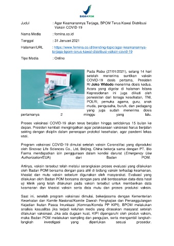 Judul : Agar Keamanannya Terjaga, BPOM Terus Kawal Distribusi