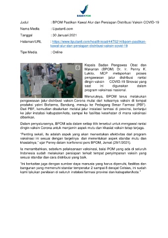 Judul : BPOM Pastikan Kawal Alur dan Persiapan Distribusi Vaksin COVID-19