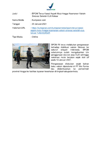 Judul : BPOM Terus Kawal Aspek Mutu hingga Keamanan Vaksin