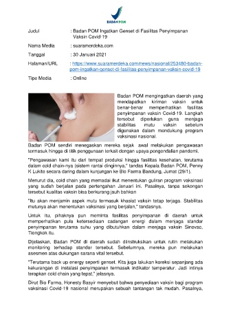 Judul : Badan POM Ingatkan Genset di Fasilitas Penyimpanan