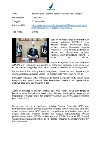 Judul : BPOM Kawal Distribusi Vaksin, Pastikan Mutu Terjaga