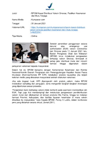Judul : BPOM Kawal Distribusi Vaksin Sinovac, Pastikan Keamanan