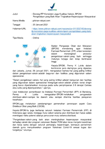 Judul : Dorong IFP Konsisten Jaga Kualitas Vaksin, BPOM:
