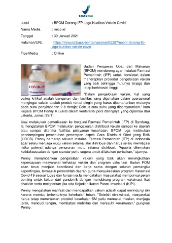 Judul : BPOM Dorong IFP Jaga Kualitas Vaksin Covid