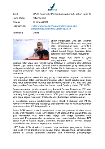 Judul : BPOM Kawal Jalur Pendistribusian dan Mutu Vaksin Covid-19