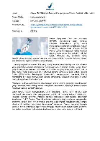 Judul : Wow! BPOM Minta Tempat Penyimpanan Vaksin Covid19 Miliki Hal Ini