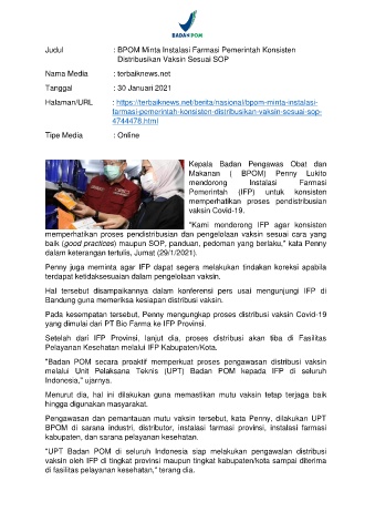 Judul : BPOM Minta Instalasi Farmasi Pemerintah Konsisten