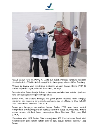 Kepala Badan POM RI, Penny K. Lukito pun sudah meninjau langsung kesiapan
