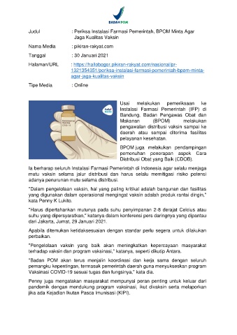 Judul : Periksa Instalasi Farmasi Pemerintah, BPOM Minta Agar