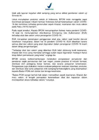 Pada rapat tersebut, Kepala BPOM menyampaikan bahwa masa pandemi COVID-