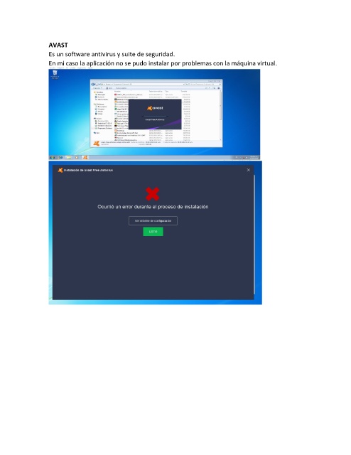 AVAST Es un software antivirus y suite de seguridad. En mi caso la aplicación no se pudo instalar por problemas con la máquina virtual.