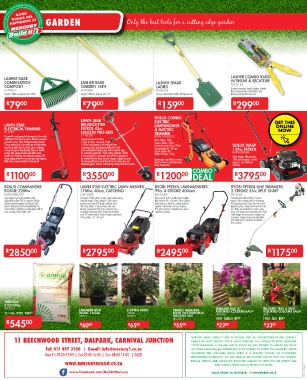 South African conditions making light work of wheels. Convenient 40ℓ grass collection box. 45ℓ grass catcher, minimises time spent of 2.0mm pre-loaded line, makes easy