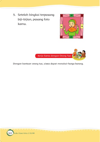 5. Setelah bingkai terpasang biji-bijian, pasang foto kamu. Kerja Sama dengan Orang Tua Dengan bantuan orang tua, siswa dapat menaksir harga barang. 122 Buku Siswa Kelas 2 SD/MI
