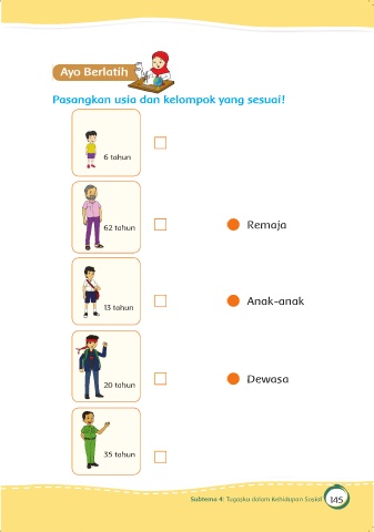 Ayo Berlatihh Pasangkan usia dan kelompok yang sesuai! 6 tahun 62 tahun Remaja Anak-anak 13 tahun Dewasa 20 tahun 35 tahun Subtema 4: Tugasku dalam Kehidupan Sosial 145