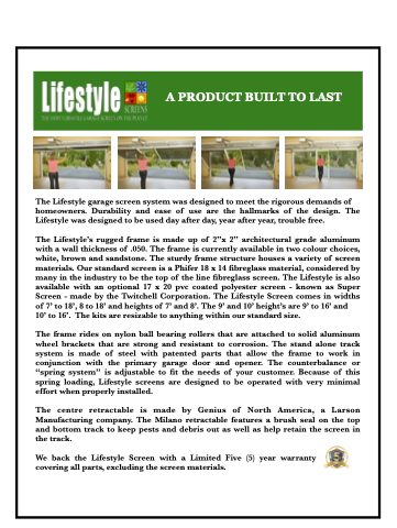 The Lifestyle garage screen system was designed to meet the rigorous demands of homeowners. Durability and ease of use are the hallmarks of the design. The Lifestyle was designed to be used day after day, year after year, trouble free.