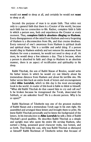 inherent in sleep. When he approaches sleep in that way, he will see moment. Thus, complete faith is absolute clinging to Hashem. inherent in sleep. When he approaches sleep in that way, he will see