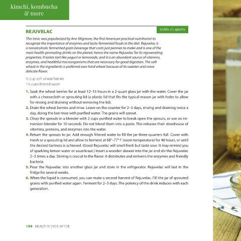 kimchi, kombucha            per day.  ally increase to 1 quart   ing properties. Gradu-  to Rejuvelac’s cleans-  becomes accustomed   day until your body   ounces (1 cup) per   Rejuvelac lemonade.  lemon with stevia for   or add a squeeze of   and steep for 2 hours,   quart of Rejuvelac   peach, lemon) per   tea bag (raspberry,   Rejuvelac.  water for making   only purified filtered   wish to cultivate. Use   kill the bacteria you   found in tap water will   •  Begin drinking 8   •  Add o