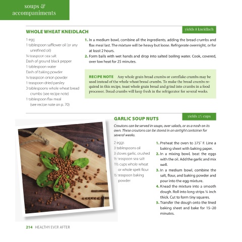 214 HEALTHY EVER AFTER serve with Garlic Soup Nuts (p. 214). tency. Garnish with leek slices and sion blender for a creamy consis- ditional 30 minutes. per, and basil, and cook for an ad- mer for 25 minutes. cover the vegetables, and sim- 20 minutes. Add water just to parsnips, and garlic in the oil for 3. If desired, blend with an immer- 2. Add the 5 cups of water, salt, pep- 1. In a 4-quart pot, sauté the leeks, Leek slices, for garnish Dash of basil Dash