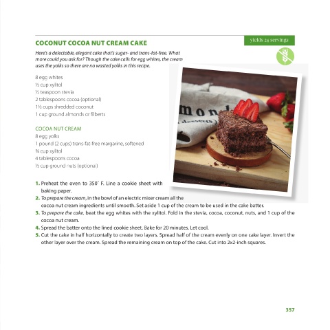 ture into the greased baking dish 3. To prepare the cake, beat the egg whites with the xylitol. Fold in the stevia, cocoa, coconut, nuts, and 1 cup of the