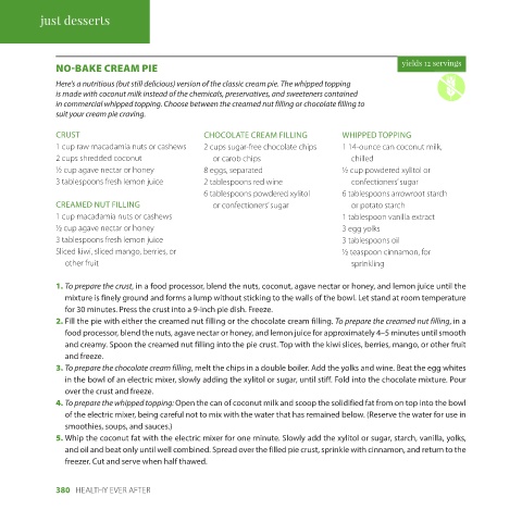 380 HEALTHY EVER AFTER with a pinch of stevia. extract, and carob powder until smooth, using a spatula to scrape the sides every once in a while. Sweeten to taste If the mixture is too loose, let stand at room temperature for 30 minutes. and nuts, for garnish water for 4 hours and drained 4. Spoon the mixture into the crust. Garnish with mint leaves, cranberries, blueberries, and/or nuts. Chill and serv