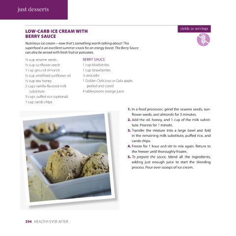 394 HEALTHY EVER AFTER molds and freeze. Thaw for 10 minutes before serving. nut milk, and frozen strawberries. Pour into the heart-shaped juice until the juice is absorbed. Insert popsicle sticks. Freeze. the sorbet into 6 popsicle molds or plastic cups, ½ cup each. VARIATION After blending for the second time, pour minute. Freeze for 3 hours. mond butter in a blender and blend for 1 full minute. 3. In the food processor, process the froz