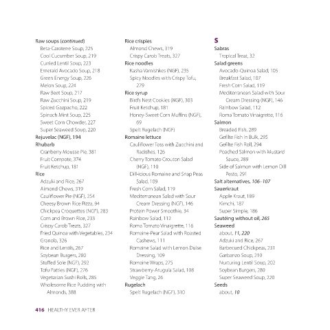 416 HEALTHY EVER AFTER Salad, 109 Cookies (NGF), 306 Sauce, 394 Sauce, 260 323 (NGF), 110 Dill-icious Romaine and Snap Peas Strawberry-Date Sherbet, 391 Yeast-Free Quick Rolls (NGF), 54 White Spelt Crackers (NGF), 313 Vegetarian Sushi Rolls, 285 Sprouted Grain Challah (NGF), 56 Spelt Challah (NGF), 58 Spelt Flatbread (NGF), 63 Sesame-Sunflower Refrigerator Sesame Sticks (NGF), 312 Sesame Salt, 106 Sesame Julienne, 114 Red Cabbage Sesame Salad, 121 Organic W