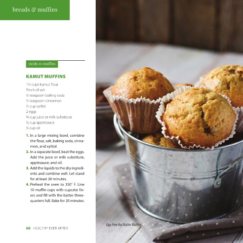 68 HEALTHY EVER AFTER meal. RECIPE NOTE Rice flour may be used instead of corn liners and fill two-thirds full. Bake for 20 minutes. for at least 1 hour or refrigerate overnight. oil, and apple cider and add to the dry ingredients. Let stand namon, and salt. Set aside. muffin. Add an additional 1/3 cup honey or molasses for a sweeter spelt flour. flour, can be used instead of regular whole wheat or whole spelt flour, where the grain i