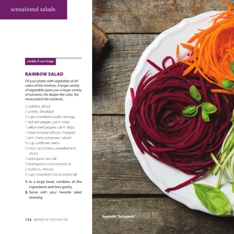 112 HEALTHY EVER AFTER marinara sauce and toss well. 3. To prepare the sauce, blend all the ingredients until smooth. Top the Vegetable Spiraghetti with the 2. To soften the vegetables, sprinkle with the salt and let stand for 1 hour. 1. Use a mandolin or spiral vegetable cutter to spiralize the vegetables. 2 teaspoons psyllium husks powder Dash of stevia powder (optional) 1 teaspoon thyme 1 teaspoon oregano 1 tab
