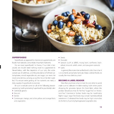 Some say, “We are what we eat,” but it has been proven that tions based on season, supply, and taste. You’ll widen your preventing, health-promoting “superfoods” in your family’s diet: shopping for groceries. Ignore the front label, where the