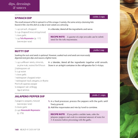 160 HEALTHY EVER AFTER unrefined oil or juice of ½ lemon ents at high speed until creamy. In a blender, blend all the ingredi- 3 sprigs parsley (optional) 2 tablespoons mustard 1 tablespoon sesame or any 2 scallions or 1/8 onion 4 tablespoons water 3 tablespoons apple cider vinegar ½ teaspoon sea salt 2½ tablespoons tahini 4 ounces tofu calcium and iron. only low in calories, but also offers Use this salad enhancer freely; it’s not CREAMY TOFU DIP Spinach