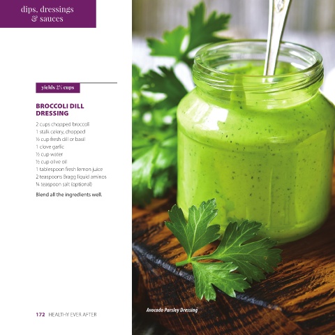 172 HEALTHY EVER AFTER ed. Thin with water as necessary to achieve the desired consistency. 2. Add the Bragg liquid aminos, tahini, olive oil, water, and lemon juice, and process until well blend- 1. Place the onion and celery in a blender and pulse until finely chopped. Juice of 1 lemon ¼ cup water 4 tablespoons olive oil ½ cup tahini 2 tablespoons Bragg liquid aminos 1 stalk celery 1 small Vidalia onion your f