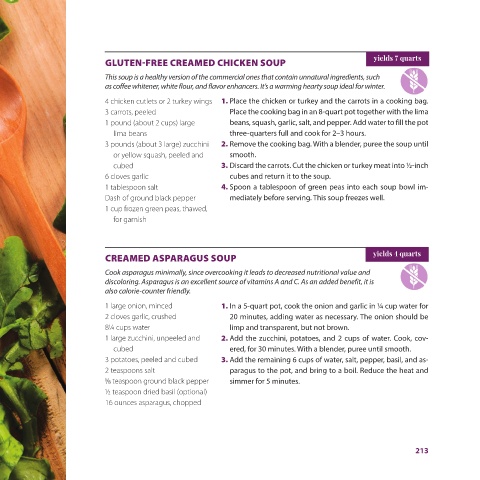 soups & yields 4 quarts yields 7 quarts serve with Garlic Croutons (p. 110). served cauliflower, and the dill. Cook for 5 more minutes and boil and cook for 30 minutes. browned, about 25–30 minutes. Stir occasionally. salt, and pepper in the oil on low heat until soft and lightly bite-size pieces. the sautéed onion and mushrooms. with an immersion blender until smooth and creamy. brown. the sliced mushrooms in the remaining ¼ cup oil until golden and cook for 2 hours. wi