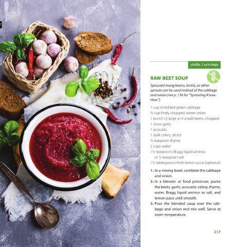 hot for garnish Adzuki bean sprouts or cubed cucumber, 1 tablespoon Bragg liquid aminos 2 cups water 1 clove garlic (optional) ¼ avocado 2 cups water Pinch of paprika 1 teaspoon Bragg liquid aminos Juice of ¼ lemon smooth. onion (optional) chopped spinach 2. Spoon into individual bowls and garnish with with the adzuki bean sprouts or cubed cucumber. 1. In a blender or food processor, puree all the ingredients except the garnish until the consistency is ¼ cup chopped red o