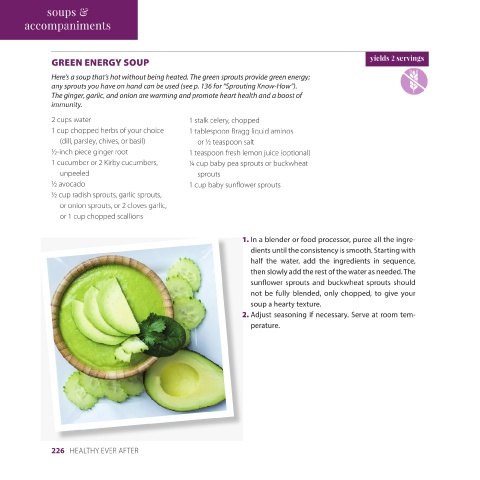226 HEALTHY EVER AFTER the soup. salt, if desired, to taste. Allow to stand at least 30 minutes before serving. der, water, oil or avocado, Bragg liquid aminos or salt, lemon juice, chopped scallions, and ginger. Add additional Set aside. for “Sprouting Know-How”) 3. When ready to serve, pour the blended soup into 2 individual bowls and spoon the chopped vegetable mixture into 2. In a blender or food
