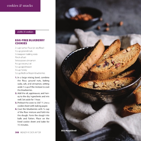 308 HEALTHY EVER AFTER sheet. Bake an additional 10 minutes until slightly toasted. and bake for 25 minutes. knife. Spread the apricot jam on top of each loaf, if desired, lined cookie sheet. monds and knead until a soft dough is formed. paper. 5. Cut slight indentations into the top of the logs with a sharp 4. Divide the dough in half, and form two even logs. Place on the 3. Add the egg, flour, baking powder, salt, vanilla, chips, and al-