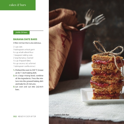 352 HEALTHY EVER AFTER per. 9x13 inches in size. Invert the dough over the filling in the baking dish and peel off the baking pa- over the baked crust. minutes, stirring constantly. Remove from the heat. Add the vanilla and let cool. Blend and spread 1 teaspoon vanilla extract 5 Medjool dates, chopped 1 cup fresh cranberries ½ cup plus 2 tablespoons oil ¼ teaspoon salt 1 teaspoon baking soda ½ cup honey 2 cups