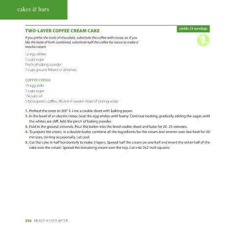 356 HEALTHY EVER AFTER other layer over the cream. Spread the remaining cream on top of the cake. Cut into 2x2-inch squares. cocoa nut cream. cocoa nut cream ingredients until smooth. Set aside 1 cup of the cream to be used in the cake batter. 5. Cut the cake in half horizontally to create two layers. Spread half of the cream evenly on one cake layer. Invert the 4. Spread the batter onto the lined cooki