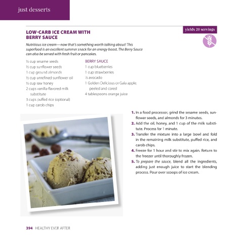 394 HEALTHY EVER AFTER molds and freeze. Thaw for 10 minutes before serving. nut milk, and frozen strawberries. Pour into the heart-shaped juice until the juice is absorbed. Insert popsicle sticks. Freeze. the sorbet into 6 popsicle molds or plastic cups, ½ cup each. VARIATION After blending for the second time, pour minute. Freeze for 3 hours. mond butter in a blender and blend for 1 full minute. 3. In the food processor, process the froz