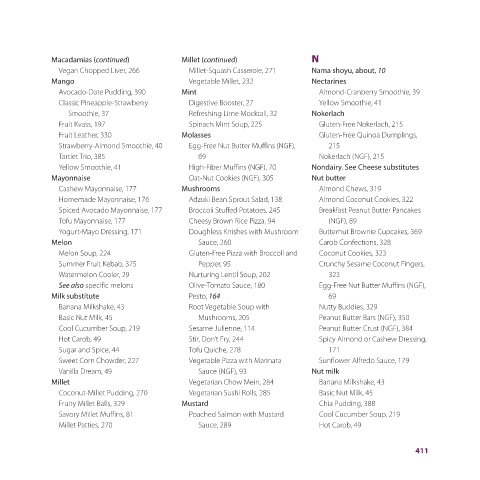 Corn Pasta Salad with Yogurt Broccoli Slaw, 135 Carob Brownies (NGF), 350 Vegan Chopped Liver, 266 Millet-Squash Casserole, 271 Nama shoyu, about, 10