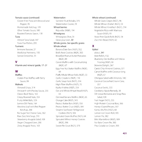 Raw Zucchini Soup, 219 Bird’s Nest Cookies (NGF), 303 Cream Dressing (NGF), 146 Tuna Flax Patties, 293 Whole grains. See specific grains
