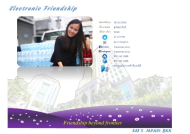 รหัส นักศึกษา 5810125065 ชื่อ-นามสกุล สุภัสสราปันธิ เพื่อนๆ เรียก พลอย 21 มกราคม 02 5772360-3 Supassara ploy Supassara ploy 099 165 1888 099 165 1888 ขอบคุณมิตรภาพดีๆที่มอบให้ Friendship beyond frontier