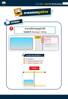 คู่มือการใช้งาน 71 สามารถตั้งค่าขอบรูปร่างได้ ่ โดยคลิกที Rectangle Setting 1.Click 1 2 3 ่ ความหมายของค าสังต่าง ๆ ้ 1 เปิดการใชงาน ก าหนดความโค้งของรูปร่าง (กว้าง) 2 ก าหนดความโค้งของรูปร่าง (ยาว) 3 ตัวอย่าง