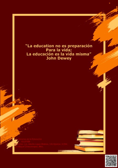 “La education no es preparación Para la vida; La educación es la vida misma” John Dewey Lic. Ciencias de la Educación IULATAM Dirección: Lic. Adolfo López Mateos, 135 Ojuelos. 51350. San Miguel Zinacantepec, Méx.