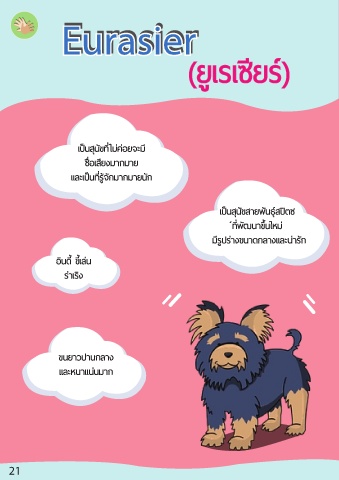 Eurasierurasier Eurasier E Eurasier (ยูเรเซียร์) ่ เป�นสุนัขทีไม่ค่อยจะมี ่ ชือเสียงมากมาย ่ เเละเป�นทีรู้จักมากมายนัก เป�นสุนัขสายพันธุ์สปิตซ ่ ์ทีพัฒนาขึ�นใหม่ มีรูปร่างขนาดกลางและน่ารัก อินดี� ขี�เล่น ร่าเริง ขนยาวปานกลาง และหนาแน่นมาก 21