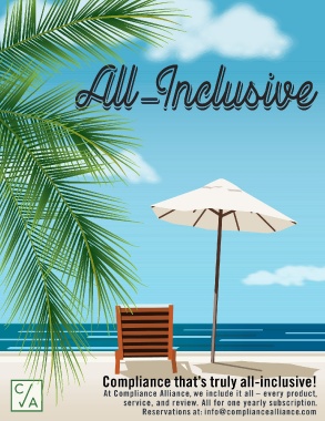 All Inclusive – C M Y CM MY CY CMY K Compliance that’s truly all-inclusive! At Compliance Alliance, we include it all – every product, service, and review. All for one yearly subscription. Reservations at: info@compliancealliance.com