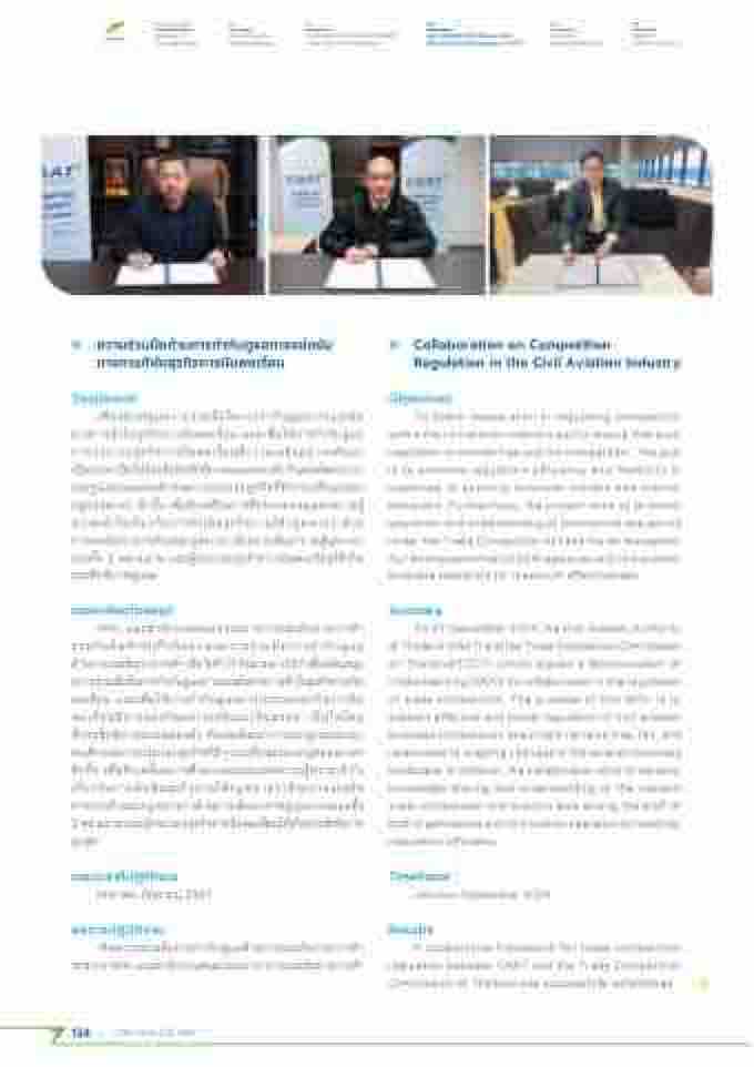On 27 September 2024, the Civil Aviation Authority ofThailand(CAAT)andtheTradeCompetitionCommission of Thailand(TCCT) jointly signed a Memorandum of Understanding (MOU) on collaboration in the regulation of trade competition. The purpose of this MOU is to support effective and timely regulation of civil aviation business competition, ensuring it remains free, fair, and responsive to ongoing changes in the aviation business landscape. In addition, the collaboration aims to advance knowledge-sharing and understanding of the relevant trade competition and aviation laws among the staff of both organizations and civil aviation operators to maximize regulatory efficiency.