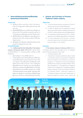 ผู้้้เข้าร่วมสำัมมนาฯ จําานวนที่ังสำิน 498 ที่่าน ภายในงานสำัมมนาฯ ม่การจด้ั แสำด้งนิที่รรศการที่่เก่ยวข้อง กับิแนวโน้มและที่ิศที่างของภาคัอุตัสำาหกรรมการบิิน เช่่น ข้อม้ลการขับิเคัล้อนนโยบิายเพิ่้อมุ่งสำ่้การเปี็น ศ้นย์กลางที่างการบิิน (Aviation Hub) การจัด้แสำด้ง ข้อม้ลสำถึิตัิภาพิ่รวมการขนสำ่งที่างอากาศของไที่ยตัังแตั่ ในช่ว่ งก่อนการแพิ่รร่ ะบิาด้ของเช่อ้ ไวรสำั โคัวด้ิ -19 (ปีี 2562) เปีรย่ บิเที่่ยบิกับิภาพิ่รวมสำถึิตัิการขนสำ่งที่างอากาศในปีี 2566โด้ยช่ว่ งเช่า้ เปีน็ การบิรรยายหวั ขอ้ “ปีฐมบิที่สำ่ก้ ารเปีน็ ศน้ ยก์ ลางการบินิ ภม้ ภิ าคั” บิรรยายโด้ย นายสำทีุ่ ธพิ่ิ งษ์ คังพิ่ล้ ผู้้้อําานวยการสำําานักงานการบิินพิ่ลเรอ้ นแห่งปีระเที่ศไที่ย